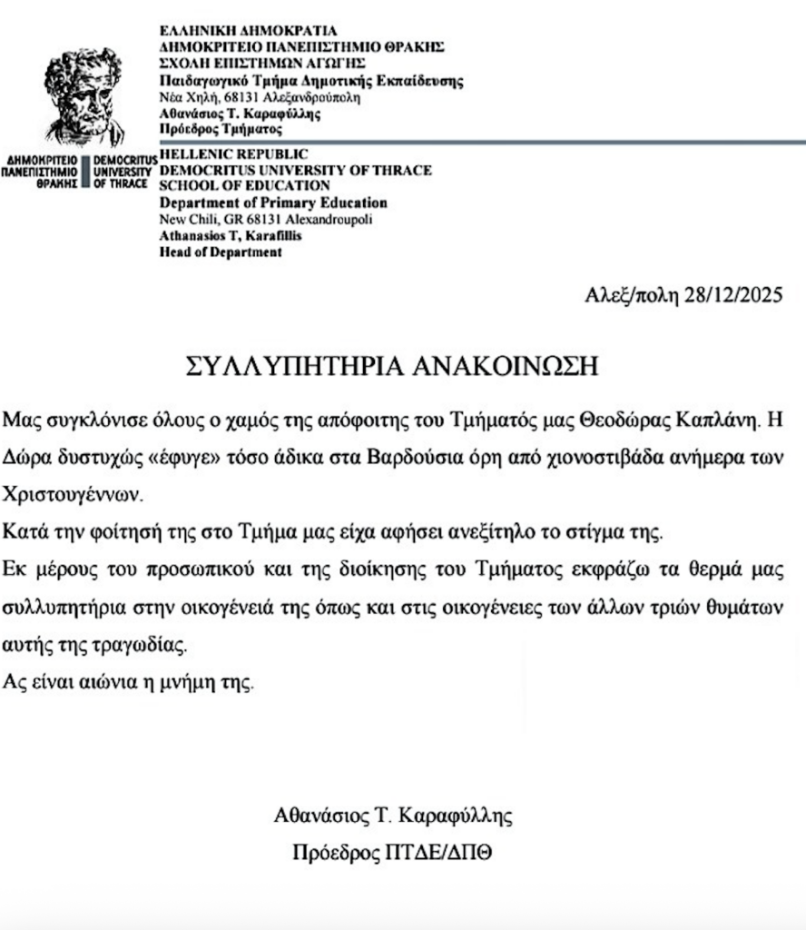 Με επίσημη ανακοίνωσή του, το Παιδαγωγικό Τμήμα Δημοτικής Εκπαίδευσης Αλεξανδρούπολης (ΠΤΔΕ) του Δημοκρίτειο Πανεπιστήμιο Θράκης εκφράζει τη βαθιά του οδύνη για τον άδικο χαμό της παλαιάς φοιτήτριάς του.