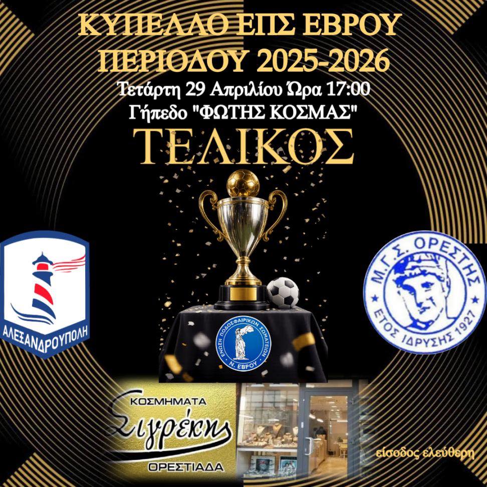 Την Τετάρτη 29 Απριλίου στις 17:00 στο στάδιο «Φώτης Κοσμάς» της Αλεξανδρούπολης θα διεξαχθεί ο τελικός του Κυπέλλου ΕΠΣ Έβρου.