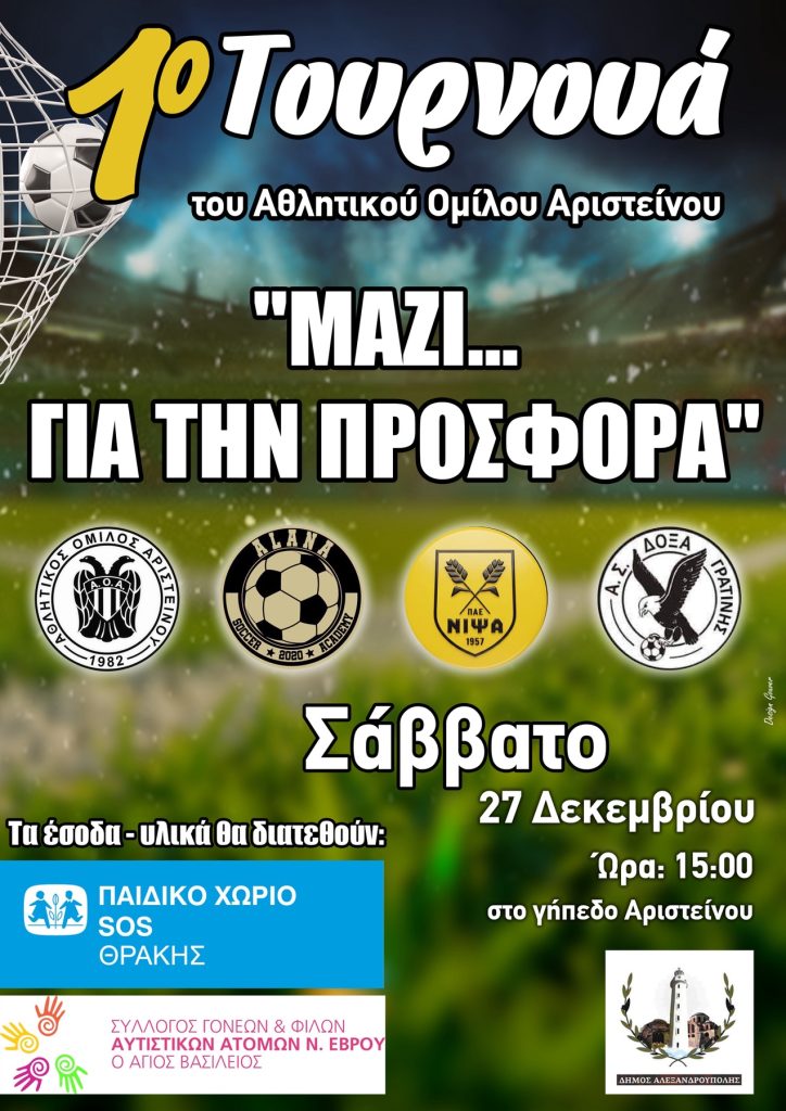 Το 1ο Τουρνουά «ΜΑΖΙ… ΓΙΑ ΤΗΝ ΠΡΟΣΦΟΡΑ» διοργανώνει ο Α.Ο. Αριστείνου.