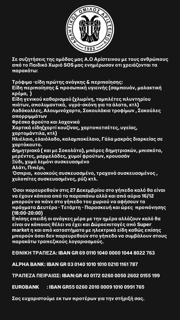 Η συγκέντρωση ειδών πρώτης ανάγκης θα γίνεται και σε ώρες προπόνησης της ομάδας.