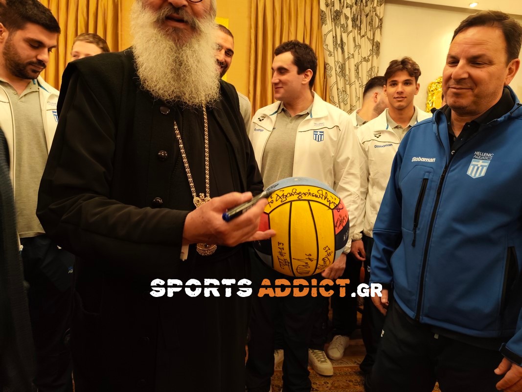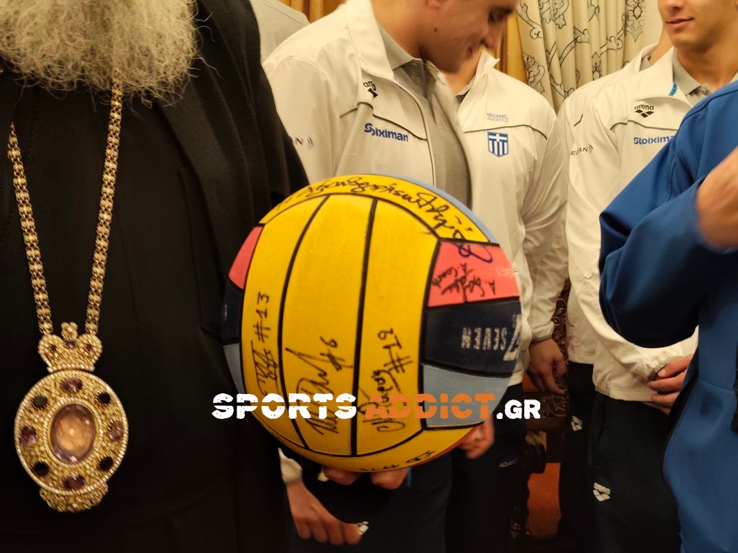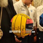 Χάρισε αναμνηστικά και υπέγραψε στην μπάλα υδατοσφαίρισης που του πρόσφεραν οι διεθνείς με τις υπογραφές τους.
