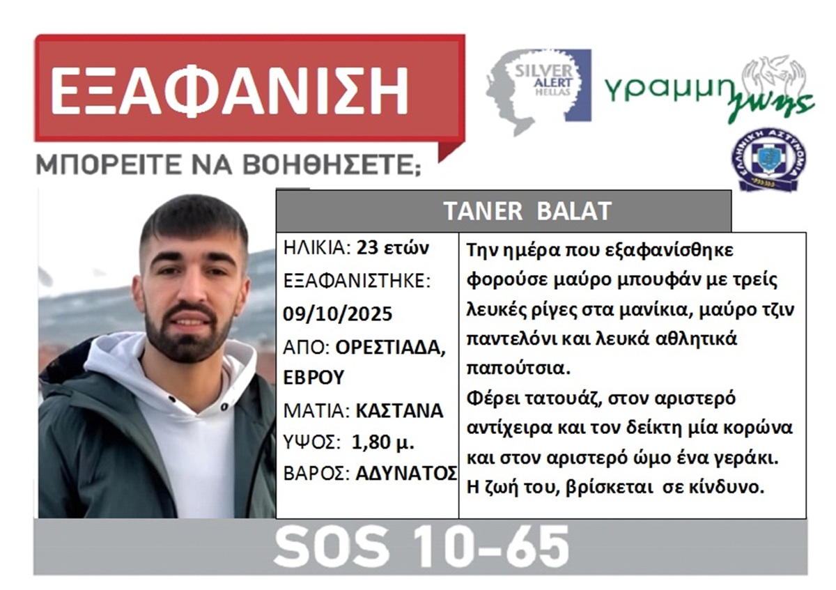 Συναγερμός σήμανε στις αρχές για την εξαφάνιση ενός 23χρονου από την περιοχή του σταθμού ΚΤΕΛ, στην Ορεστιάδα Έβρου. Σύμφωνα με ανακοίνωση της Γραμμής Ζωής, ο